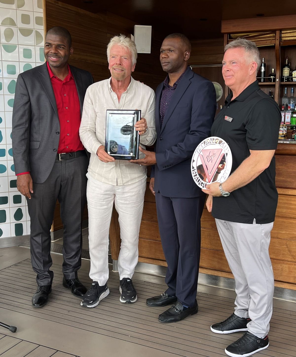 A plaque was presented on behalf of the Government and people of the Virgin Islands by the Premier and Minister of Finance, Hon. Dr. Natalio Wheatley to Sir Richard Branson and the captain of the Valiant Lady, Captain Justin Lawes commemorating the vessel’s inaugural call to the Territory. The plaque and key exchange ceremony took place onboard the ship while it was docked at the Cruise Pier in Tortola.